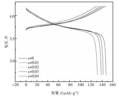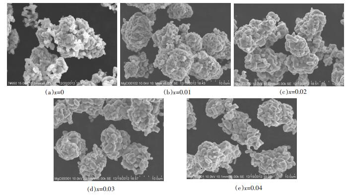 2 layered structures with no obvious changes in particle sizes. The initial specific discharge capacity were 138.2 and 145.3 mAh/g for the cathode materials doped with 0.03 Mg and the undoped cathode materials. The specific discharge capacities were 131.1 and 119.5mAh/g separately after 50 cycles. The results indicated the cycle performance increased notably after doping Mg though the initial specific discharge capacity decreased slightly.