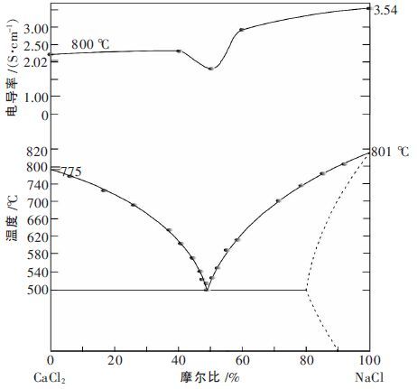 2)=1∶1, namely the system of minimum total melting point appeared the low end of its conductivity, and the conductivity also increases with the increase of NaCl and CaCl