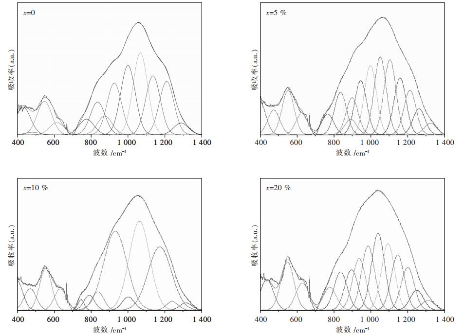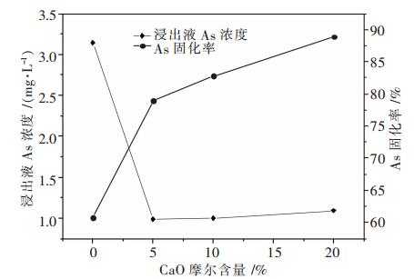 x=0, 5, 10, 20 mol%)(sodium-iron-boron-phosphorous, SIBP) glasses are studied and the results indicate that the addition of 20 mol% CaO in the SIBP glasses decreases the leaching concentration of arsenic from 3.14 mg/L to 0.99 mg/L, and the ratio of arsenic immobilized in the glass increases from 60.78 % to 88.87 %. The Q2 bridge oxygen structure can be broken by the addition of CaO, which leads to depolymerization of SIBP glasses network. Simultaneously, CaO added in the glasses can depolymerize the phosphate chains and participate in the network by forming chemical bonds such as Ca-O-P, Ca-O-As bonds in the glasses which will strengthen the glass structure and compact the glass density. Moreover, with the increase of CaO, the SIBP glasses transition temperature (