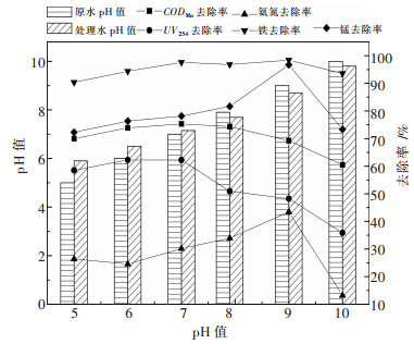 UV254, ammonia nitrogen, iron and manganese removal rates are 99.02 %, 68.78 %, 50.94 %, 33.96 %, 96.77 %, 81.67 % respectively. The effluent can meet the National Drinking Water Health Standards.