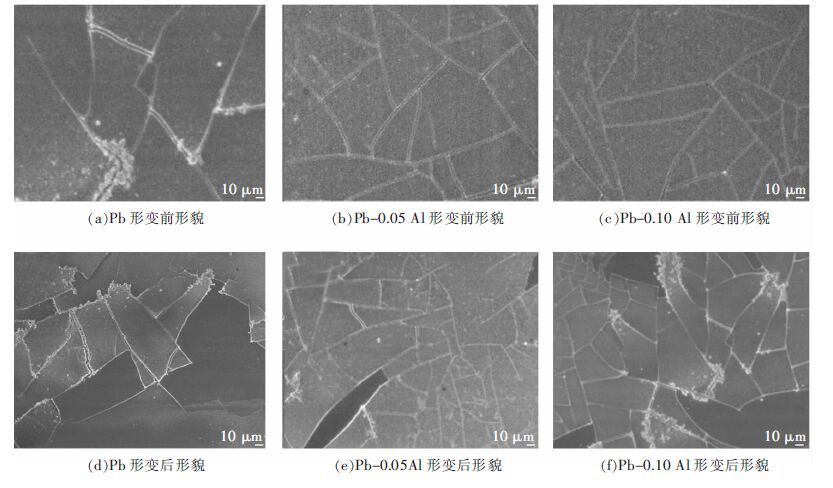 he effect of aluminum content on the re-crystallization behavior of lead was studied by applying universal testing machine and cold cathode field emission scanning microscope. The results show that the addition of Al can affect the lead's re-crystallization behavior and improve its tensile strength. When the content of Al is 0.05 %, the re-crystallization behavior is inhibited obviously and the tensile strength increases from 13.2 MPa to 17.9 MPa. However, when Al content is increased to 0.10 %, the inhibition effect weakens, and the tensile strength declines from 17.9 MPa to 15.5 MPa.