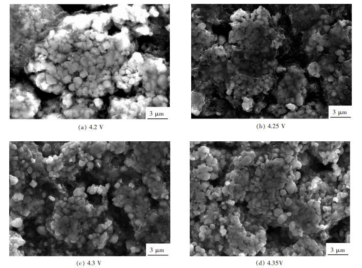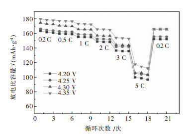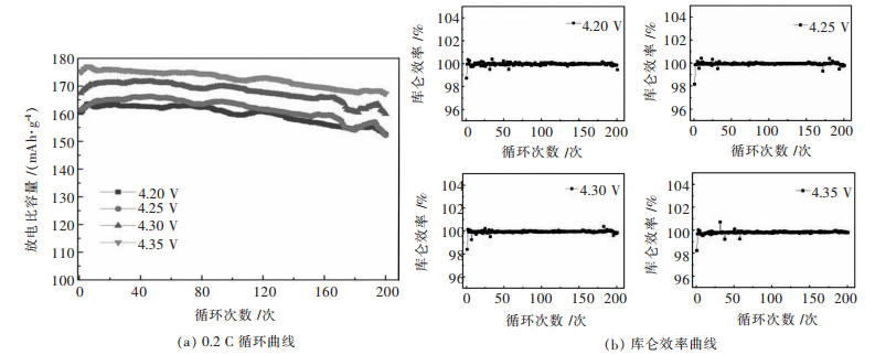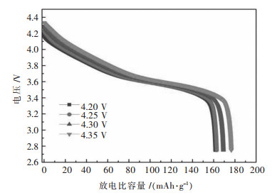 I104 ratio was less than 1.2 and cation disorder increased when the upper limit of voltage was 4.35 V. When the upper voltage limits was 4.2 V, 4.25 V, 4.3 V, and 4.35 V, the first discharge capacity of the batteries was 161.5 mAh/g, 162.9 mAh/g, 169.2 mAh/g, and 176.6 mAh/g, respectively. When the upper voltage limit was 4.25 V, 4.3 V and 4.35 V, the capacity was 0.87%, 4.77% and 9.35% higher than that at the upper voltage limit of 4.2 V, respectively. After 200 cycles (0.2 C), the batteries′ capability retention rate was 95.09%, 94.41%, 95.52%, and 95.56%, respectively, at the upper voltage limits of 4.2 V, 4.25 V, 4.3 V and 4.35 V. At the upper voltage limit of 4.35 V, although the batteries had cation disorder, their electrochemical performance was the best. It may be due to excessive charge injection of high valence Co ions into the Li layer. Thus, high electron conductivity was obtained when Co ions passed through the grain boundary network inside the large secondary particles.