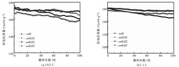 x was 0.02, the special capacity of the first discharge was 172.9 mAh/g and the capacity retention rate was 97.47% after 100 cycles at 25℃, within the voltage range of 2.75~4.2 V and with the ratio of 0.2 C. At 50℃and with the ratio of 0.5 C, the capacity retention rate changed little after 100 cycles and the average discharge specific capacity was 183.7 mAh/g. Moreover, the sample had good rate performance.