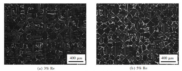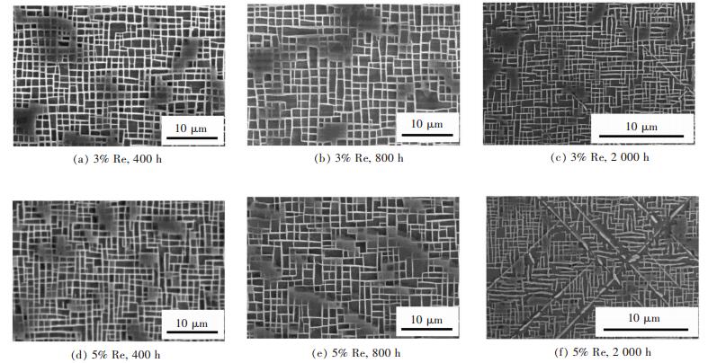 In order to optimize the Re content in single crystal superalloy, 3%Re and 5%Re nickel-based single crystal super alloys were prepared in a vacuum directional solidification furnace. After heat treatment, they were exposed to 980 ℃ for 400 h, 800 h, and 2 000 h.Besides, their tensile properties were tested when heated to 1 100 ℃.Phase diagrams of the alloys with different Re content were calculated by JMatPro software. The effects of Re contents on dendrite structure, heat treatment structure, heat treatment microstructure and their microstructure changes at different heating temperature and for different duration were investigated by optical microscope(OM), scanning electron microscope (SEM), and energy dispersive spectrometer(EDS). The results show that as the Re content in the single crystal superalloy increases, the primary dendrite spacing decreases slightly while the volume fraction of the eutectic increases.When the size of the γ′phase decreases, the degree of cubic increase. There is no precipitation of TCP phase in two alloys with different Re content after 800 hours′ heating; after heating for 2 000 h, TCP phase precipitated, and its volume fraction increased with the increase of Re content. It can also be concluded that with the increase of Re content, the stability of alloy structure decreases while the tensile properties of the alloy at high temperature significantly increase.