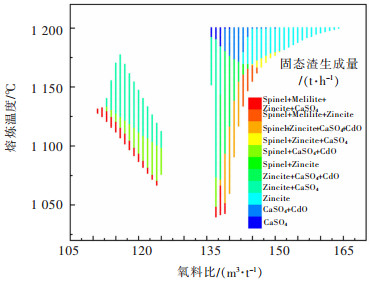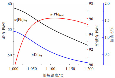 Thermodynamic simulation of lead side-blowing oxidation smelting process was carried out by FactSage software. The calculated equilibrium phase composition was consistent with the actual output, which verified the feasibility of thermodynamic analysis. The effects of oxygen-to-feed ratio and melting temperature on the distribution ratio of elements among each equilibrium phase were studied. The results showed that with the increase of oxygen-to-feed ratio, the proportion of valuable elements such as lead and copper into high lead slag will raise, and the desulfurization effect of furnace charge will be better, but at the same time, the impurity content in lead liquid will rise correspondingly; Increasing the smelting temperature is beneficial to reduce the sulfur content of slag and improve the grade of crude lead. But higher temperature will aggravate the volatilization of valuable metal elements such as lead and zinc. The lead side-blowing oxidation smelting could be controlled, by using the macro process to calculate batch balance. Under the condition that the quality of crude lead and high-lead slag reaches the desired value, the process is optimized via comprehensively considering the direct yield of valuable elements and the soot rate. It is suggested that the oxygen-to-feed ratio should be controlled at about 124 m