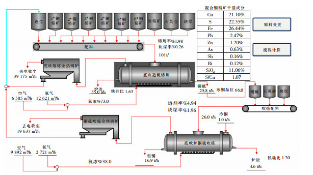 3, MgO in the smelting slag were 0.05%, 0.96%, 1.59%, 1.13%, 1.09%, 1.17%, 2.45% and 0.67%, respectively. Those of Cu, S, Fe, As, Sb, Bi, Pb, Zn in the bottom blowing process of blister copper were 0.43%, 0.03%, 0.01%, 0.07%, 0.046%, 0.006%, 0.32%, 0.014%, respectively, and those of Cu, S, Fe, Pb, Zn in slag converting were 1.83%, 0.06%, 11.35%, 11.92%, 2.36% respectively. The above calculations provides the basis for industrial production guidance and industrial design.