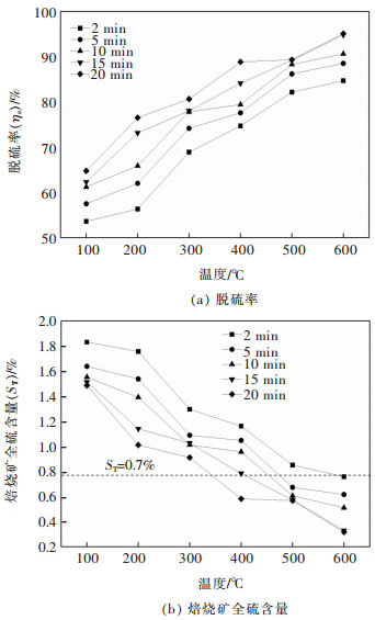 In this paper, microwave roasting method was used to study the desulfurization effect of high-sulfur bauxite, and the roasted ores after roasting and desulfurization were dissolved by Bayer method, and the influence of microwave roasting conditions on the dissolution rate of alumina was studied. The results showed that as for microwave roasting desulfurization of high-sulfur bauxite, its roasting temperature had a more significant effect on the desulfurization rate than the roasting time. When the roasting temperature increased from 100 ℃ to 600 ℃, the desulfurization rate could increase by about 30% on average. When the time was extended from 2 min to 20 min, the desulfurization rate only increased by about 12% on average. Roasting at 600 ℃ for 20 min could remove the total sulfur content of bauxite from 3.875% to 0.223 5%, and the desulfurization rate reached 95.11%. At the same time, the microwave roasting temperature had a significant effect on the dissolution rate of alumina. As the microwave roasting temperature increased, the relative dissolution rate of alumina tended to increase first and then decrease. When the microwave roasting temperature was 400 ℃, the relative dissolution rate of aluminum in the roasted ore reached the maximum up to 94.77%; when the temperature was higher than 400 ℃, a large amount of corundum (Al