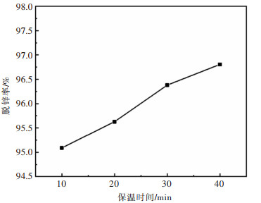 摘要: 为了最大程度地发挥高炉灰与转炉灰的经济价值, 提高冶金固废资源利用率, 以高炉灰和转炉灰为原料, 采用微波法还原高炉灰与转炉灰中Zn、Fe等有价值元素并对其回收。此法利用微波热扩散均匀、升温速率快的特性, 大大降低反应时间, 同时还充分利用粉尘中的C进行自还原反应, 无需外配。通过正交实验探究不同因素对脱锌率的影响, 寻找还原Zn、Fe的较优条件; Zn提取完成后, 采用磁选法提取还原渣中的Fe。结果表明: 高炉灰和转炉灰配比为7:3, 还原温度区间为950~1 100℃时, 混合灰中的C可将Zn、Fe完全还原; 正交实验得到Zn脱除率因素由大到小顺序为还原温度、保温时间、料层高度、水分; 脱Zn较优工艺条件是: 还原温度1 100℃, 保温时间40 min, 料层高度0.5 cm, 水分含量为10%, 此时Zn脱除率为99.37%;还原渣经磁选后Fe回收率可达92.04%, 可作为铁精矿返回炼铁工序使用。Abstract: In order to maximize the economic value of blast furnace ash and converter ash and improve the utilization rate of metallurgical solid waste resources, blast furnace ash and converter ash are used as raw materials, and the microwave method is used to reduce valuable elements such as Zn and Fe in blast furnace ash and converter ash. Its recycling. This method uses the characteristics of uniform thermal diffusion and fast heating rate of microwave to greatly reduce the reaction time. At the same time, it also makes full use of the C in the dust to carry out the self-reduction reaction without external preparation. The orthogonal experiment is used to explore the influence of different factors on the dezincification rate and find the optimal conditions for reducing Zn and Fe; after the Zn extraction is completed, the magnetic separation method is used to extract Fe from the reduced slag. The results show that: when the ratio of blast furnace ash to converter ash is 7:3, the reduction temperature range is 950~1 100℃, and the C in the mixed ash can completely reduce Zn and Fe; the orthogonal experiment shows that the factor of Zn removal rate ranges from large to the minor sequence is reduction temperature, reduction time, material layer height, and moisture; the optimal process conditions for Zn removal: reduction temperature 1 100℃, reduction time 40min, material layer height 0.5 cm, moisture 10%, and the Zn removal rate is 99.37%; Fe recovery rate of the reduced slag after magnetic separation can reach 92.04%, which can be used as iron concentrate to return to the ironmaking process.