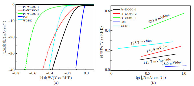 3. Then, under a nitrogen protection atmosphere, the ethanol/methanol liquid carbon source was introduced and kept warm at 1 000 ℃ for 2 h to carry out the in-situ reduction carbonization reactions and the tungsten carbide (WC@C) coated with graphified carbon layer was obtained. Different concentrations of Pt NPs in situ at WC@C surface loading yielded a Pt-WC@C compound catalyst. The catalyst Pt-WC@C-1 (10% Pt) has the best performance in an alkaline solution, with an overpotential (
