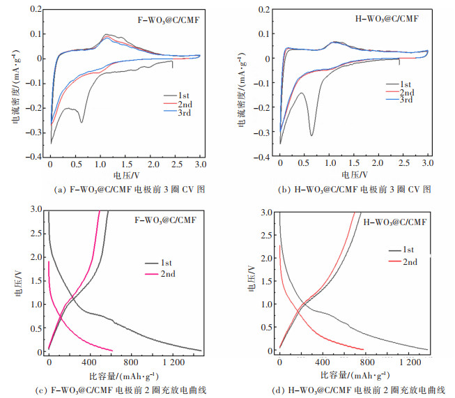 3@C/CMF (1∶1) was 1 180 mAh/g in the first cycle and 589 mAh/g after 50 cycles. The results indicated that H-WO