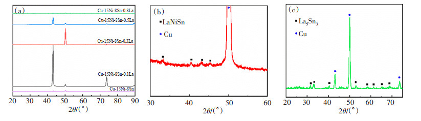 The effects of lanthanum (La) on the microstructure and characteristics of Cu-15Ni-8Sn alloy were studied using metallographic microscopy, scanning electron microscopy, and X-ray diffraction analysis. The results showed that adding trace La could refine the dendritic organization and improve dendrite segregation, and the more the La content increased, the better the effect. La could combine with Ni and Sn as the LaNiSn phase or La