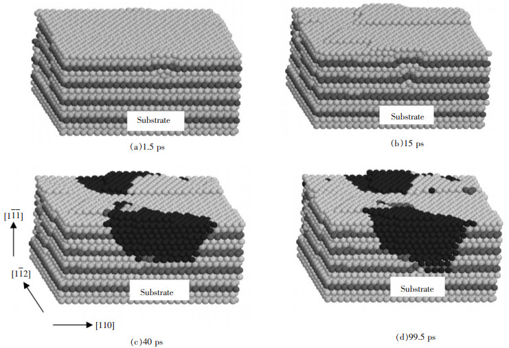 • 摘要: 采用三维分子动力学模拟方法,使用Ercolessi和Adams建立的嵌入原子法(EAM)多体势函数,模拟了二维失配铝膜晶体中失配位错的形成过程,研究了失配性质对二维失配铝膜结构及其形核机制的影响.结果显示:同等条件下,负失配度的临界厚度小于正失配度情况;负失配度较易出现失配位错;负失配度下位错的形成始于表层一个倒三角锥形的间隙原子团;正失配度下位错的形成始于表层原子的畸变区;结构稳定后,负失配度体系在表层挤出局部原子层;正失配度体系会出现塌陷.