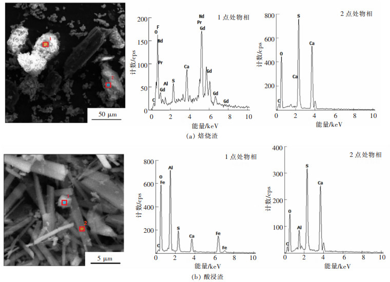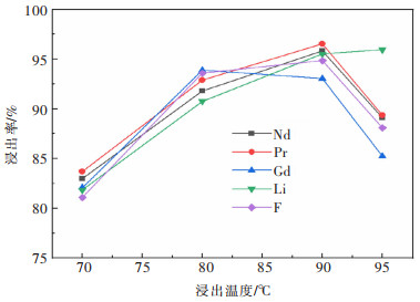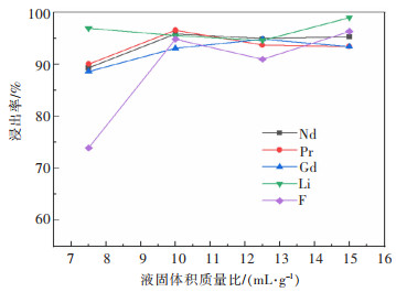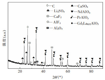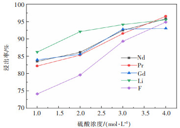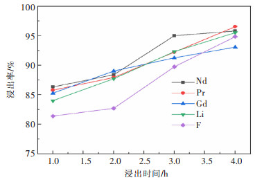 Rare earth electrolytic molten salt slag was activated by coordinated roasting with calcium oxide and aluminum sulfate, and sulfuric acid leaching was used to extract the rare earth, lithium, and fluorine in the slag. The effects of different acid leaching conditions on their leaching rates were investigated. For the leachate under the optimal acid leaching conditions, the rare earth compound salt was precipitated with sodium sulfate to realize the separation of rare earth. The results showed that the optimal acid leaching condition was sulfuric acid concentration 4 mol/L, liquid-solid volume ratio 10:1 (unit: mL/g), leaching temperature 90℃, leaching time 4 h. The leaching rates of gadolinium, lithium, and fluorine were 95.83%, 96.55%, 93.06%, 95.52% and 94.85%, respectively. The precipitation purity of rare earth complex sulfate precipitation was high, and the yield of rare earth could reach over 99.3%. The method could be used to recover rare earth, lithium, and fluorine from rare earth molten salt electrolysis slag and was of great significance for improving its utilization of all components.