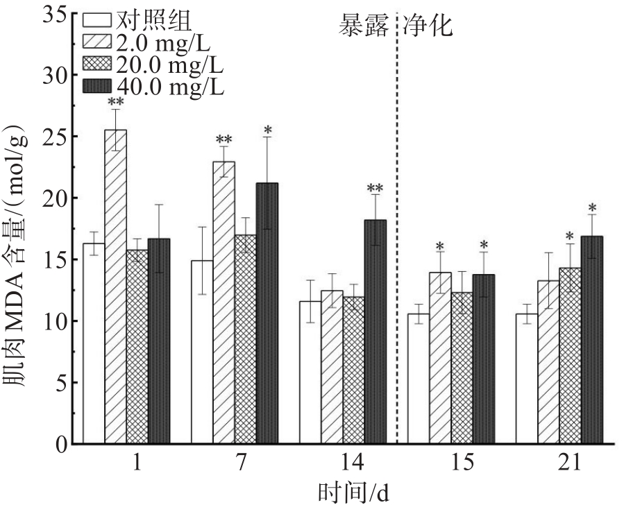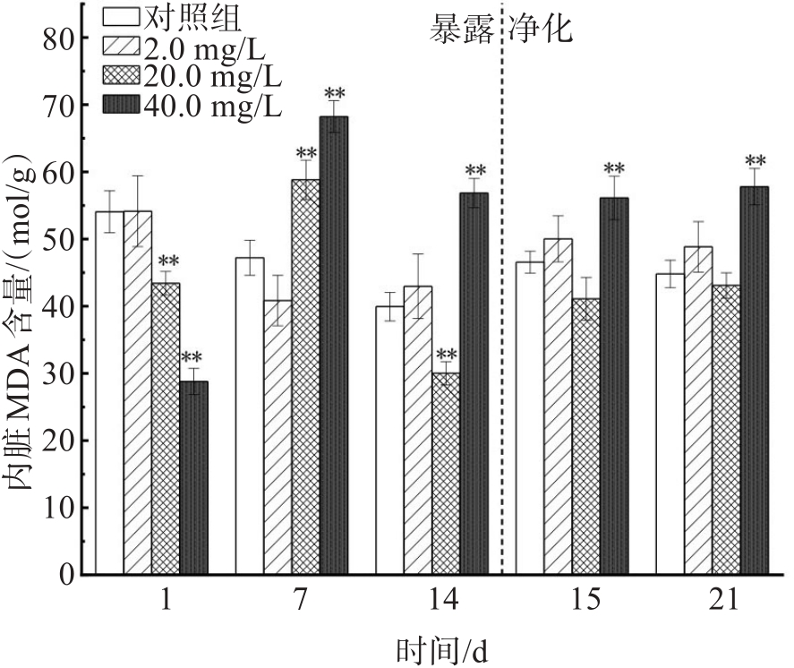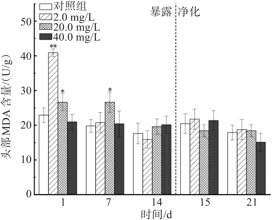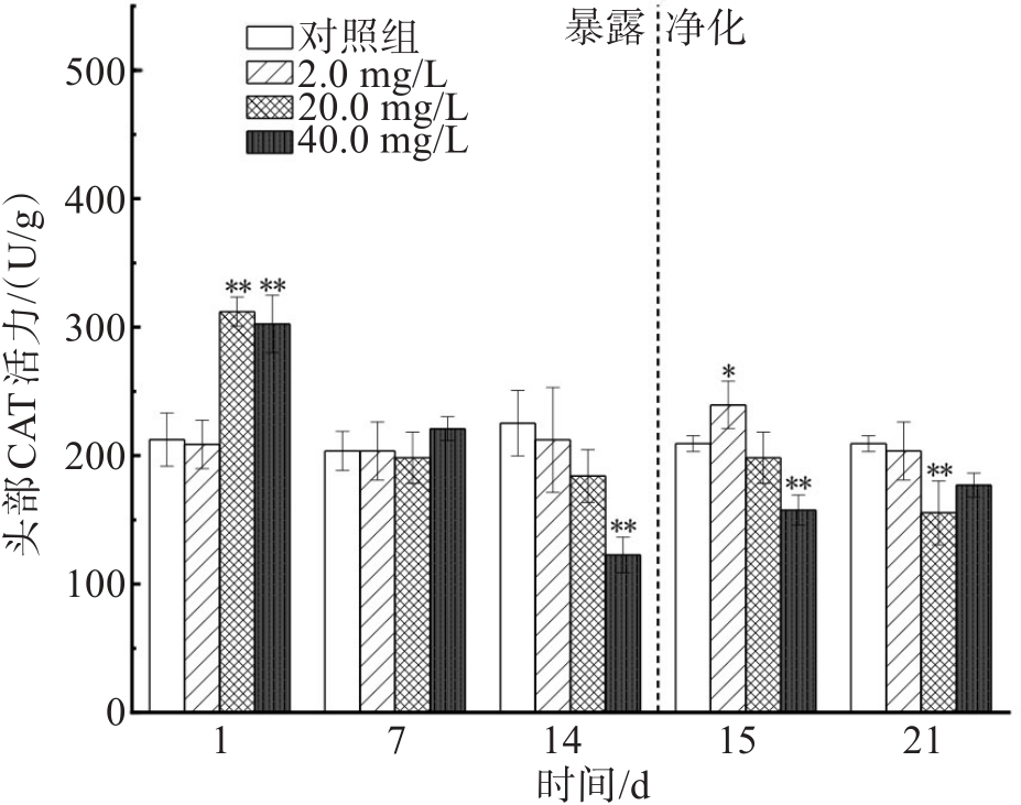 摘要: 以斑马鱼(Danio rerio)为受试鱼种,采用半静态急性暴露实验,研究了稀土离子铽(Terbium,Tb)对斑马鱼的急性毒性,并根据急性毒性实验结果设置含Tb浓度分别为2.0、20.0、40.0 mg/L 3个组,分别对斑马鱼3个组织(头部、肌肉、内脏)的过氧化氢酶(CAT)活性和丙二醛(MDA)含量进行测定,以此来研究Tb对斑马鱼的毒理作用。结果表明,高浓度Tb会对斑马鱼产生较大的毒性,Tb对斑马鱼的48 h和96 h半致死浓度(LC50)分别为81.39 mg/L和79.03 mg/L,安全浓度(CS)为7.90 mg/L;Tb3+对斑马鱼各部位CAT活性均有不同影响。随着Tb3+浓度升高,CAT活力逐渐减弱,肌肉和内脏的CAT活性也随暴露时间的增加,在呈现前期被显著诱导后又被显著抑制,但40.0 mg/L浓度组内脏的CAT活力在净化期内始终未恢复。斑马鱼内脏MDA含量受Tb3+胁迫,呈现诱导-抑制反复变化,肌肉MDA含量在胁迫期间表现为明显的诱导效应,在暴露的第14天时达到峰值为57.13%;40.0 mg/L浓度组内脏MDA含量在进入净化阶段仍被显著诱导,最高诱导率达28.99%。研究探究了Tb3+对斑马鱼的急性毒性与氧化应激毒性,对防止和减少稀土离子对水生生物的毒性作用提供参考依据。Abstract: The acute toxicity of Terbium (Tb) to zebrafish (Danio rerio) was investigated by a semi-static acute exposure test. Based on the acute toxicity test, the concentration groups of low (2.0 mg/L), medium (20.0 mg/L), and high (40.0 mg/L) of Tb were set up to determine the toxicological effects of Tb on zebrafish by analyzing catalase (CAT) activity and malondialdehyde (MDA) content in three tissues (head, muscle and viscera) of zebrafish. The results showed that a high concentration of Tb was more toxic to zebrafish. The 48 h and 96 h median lethal concentrations (LC50) of Tb to zebrafish were 81.39 mg/L and 79.03 mg/L, respectively. The safe concentration (CS) was 7.90 mg/L. Terbium (Ⅲ) ion (Tb3+) had different effects on CAT activity in various parts of zebrafish. CAT activity decreased gradually with the increase of Tb concentration. With increased exposure time in muscle and viscera, CAT activity was initially induced and then significantly inhibited, while it did not recover in viscera during the purification period in the 40mg/L group. Under Tb stress, the MDA content in viscera of zebrafish showed repeated induction-inhibition changes, while MDA content in muscle exhibited an obvious induction effect during stress, peaking 57.13% on the 14th day after exposure. The visceral MDA content of zebrafish treated with 40.0 mg/L concentration was still significantly induced at the purification phase, with the highest induction rate of 28.99%. The study revealed the acute toxicity and oxidative stress toxicity of Tb to zebrafish and provided a reference for preventing and reducing the toxicity of rare earth ions to aquatic organisms.